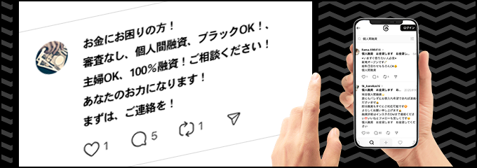特に「#個人間融資」などのハッシュタグで検索すると、無数の投稿が見つかる状況で、その多くが違法な金利を要求する闇金業者だと言われています。